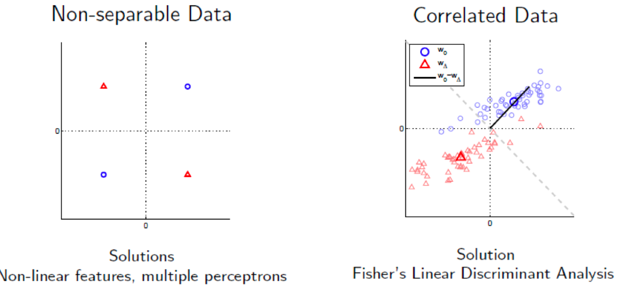 하나의 선형 모델로 분류될 수 없는 경우, 혹은 데이터가 서로 연관되어 있을 때, 퍼셉트론을 적용할 수 없다. 전자의 경우, 비선형 모델(Non-linear Model)을 사용하거나, 다중 퍼셉트론 모델(Multiple Perceptrons)으로 해결하고, 후자의 경우, 피셔의 선형 판별 분석(Fisher's Linear Discriminant Analysis)을 사용한다.