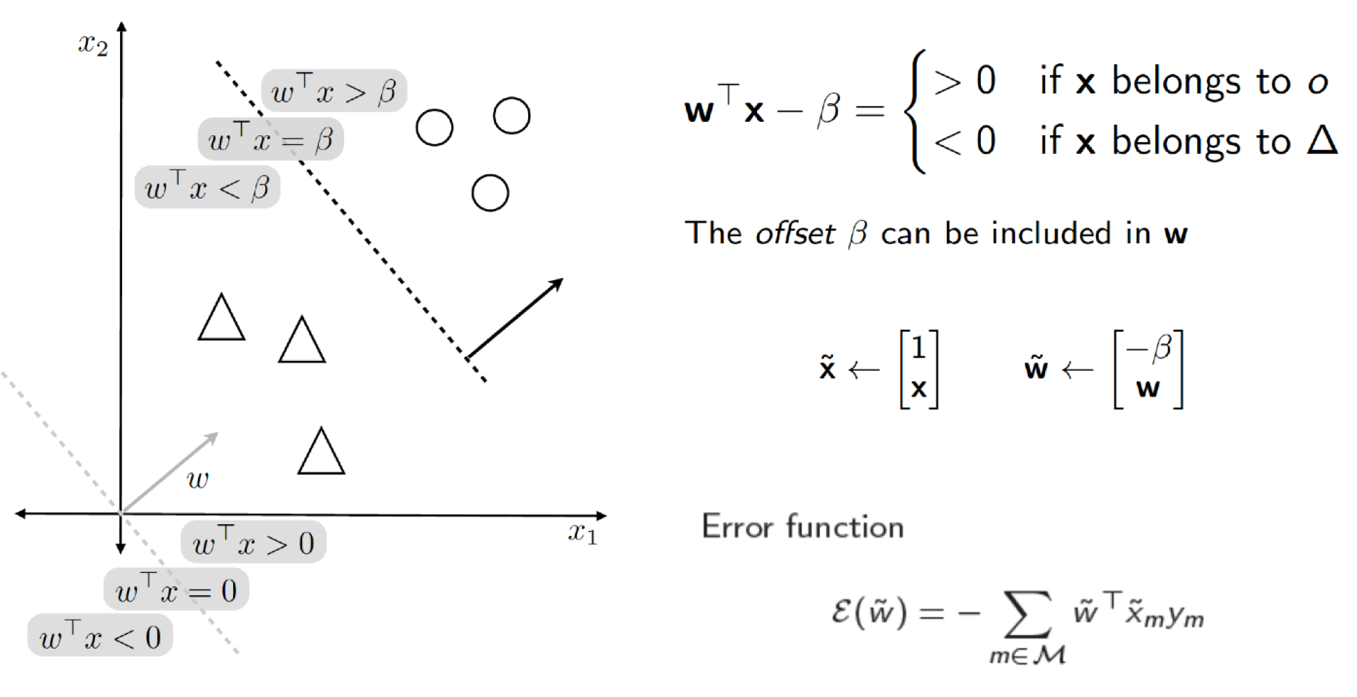\end {cases}$$※ 오프셋 및 편향(Offset or Bias)을 고려한 가중치는 $\tilde {\mathbf {w}} = (- \beta, \mathbf {w})$ $y$ 절편을 고려한 판별 함수를 간단하게 표현한다. 데이터 벡터도 마찬가지로 편향을 고려한 1을 덧 붙인 $\tilde {\mathbf {x}} = (1, \mathbf {x})$를 사용한다. 이렇게 하면 $\mathbf {w}^{\top} \mathbf {x} - \beta$ 대신 $\tilde {\mathbf {w}}^{\top} \tilde {\mathbf {x}}$를 사용한다.